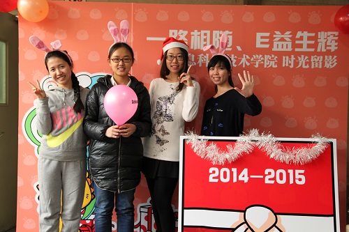 在时光留影活动中,学院在理科一号楼、理科二号楼和微纳大厦三地分别摆放了留影背景板,背景板的主体图案与新年礼物保温杯的杯面图案遥相呼应,上面还印有“一路相随、E益生辉”和“2014-2015”的字样,寓意师生们与学院一路同行、相伴成长,更充满对全院师生从2014走向2015的深切祝福。