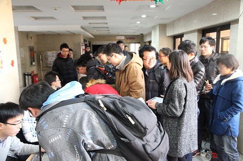 在新年礼物大派送活动中,信科师生通过“北大信科团委”、“北大信科研会”、“北大信科学生会”三个微信平台参与互动答题,题目类型包括趣味谜题、信科常识和脑筋急转弯等。老师、同学们在任意一个微信平台上连续答对三道题即可获得礼物兑换凭证,并可凭借兑换凭证和校园卡在活动现场领取学院精心准备的限量新年礼物。新年礼物是专为本次活动订制的特色保温杯,杯面图案由学院2011级本科生杨帅同学设计,内含学院E彩文化节吉祥物“软硬件攻城狮”和代表信科四个系的“计蒜鸡”、“微波鹿”、“智熊”及“版兔”,杯身上还印有“大信科”字样,图案风格清新、可爱又具有信科特色,深受师生们的喜爱。