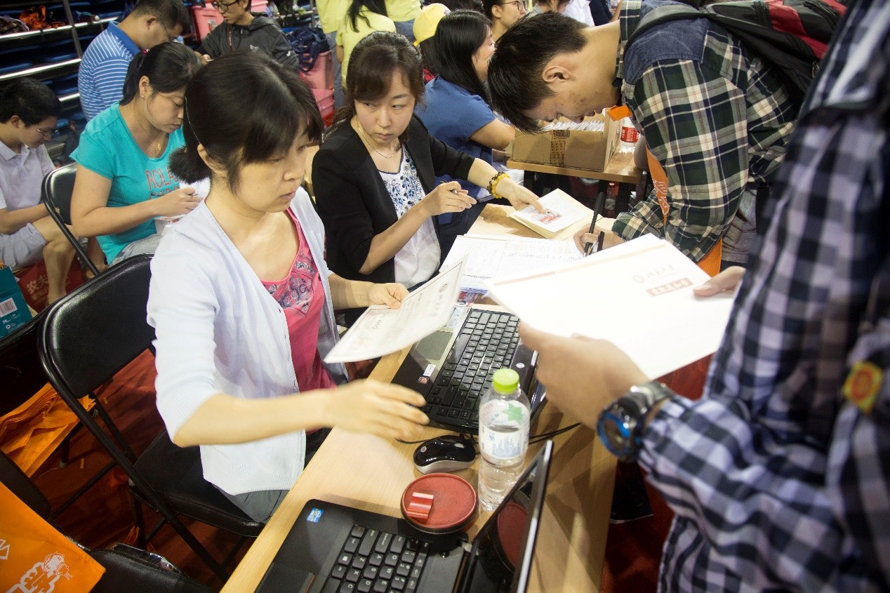 工作人员认真细致地为学生办理入学手续