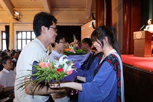 此外,典礼特别设计了“感谢师恩”、“感恩父母”和“感怀同学”环节。在感谢师恩环节,毕业生代表为在场的老师献上一束鲜花,感谢老师们多年来在学术和人生道路上的谆谆教诲;在感恩父母环节,毕业生给父母发送短信,表达内心的感激和对家人的深深爱意;在感怀同学环节,同学们与坐在身边的同学相互热烈拥抱,表达对同窗好友的依依不舍之情。