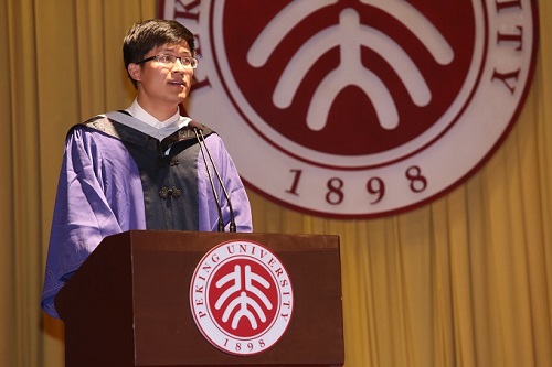 计算机系2012级硕士研究生庄希威作为学生代表表达了毕业生临别之际的所感所想。他深情讲述了“我们的骄傲”、“我们的友情”、“我们的亲人”,表达了信科人爱上北大的理由。他呼吁同学们谨记北大精神,不负北大期许,不做精致的利己主义者,做一个有所追求、有所担当、有所坚持的北大信科人。